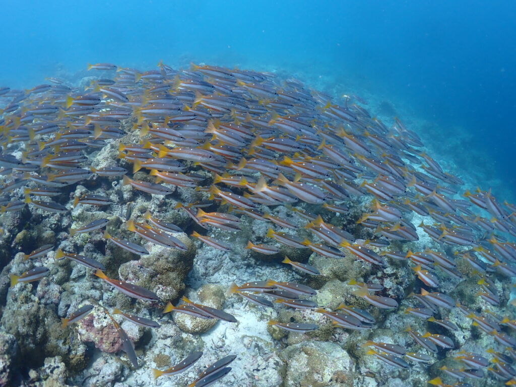 しかし、ギンガメアジ以外に!壁の様にみっしり群れるフタホシフエダイや☆